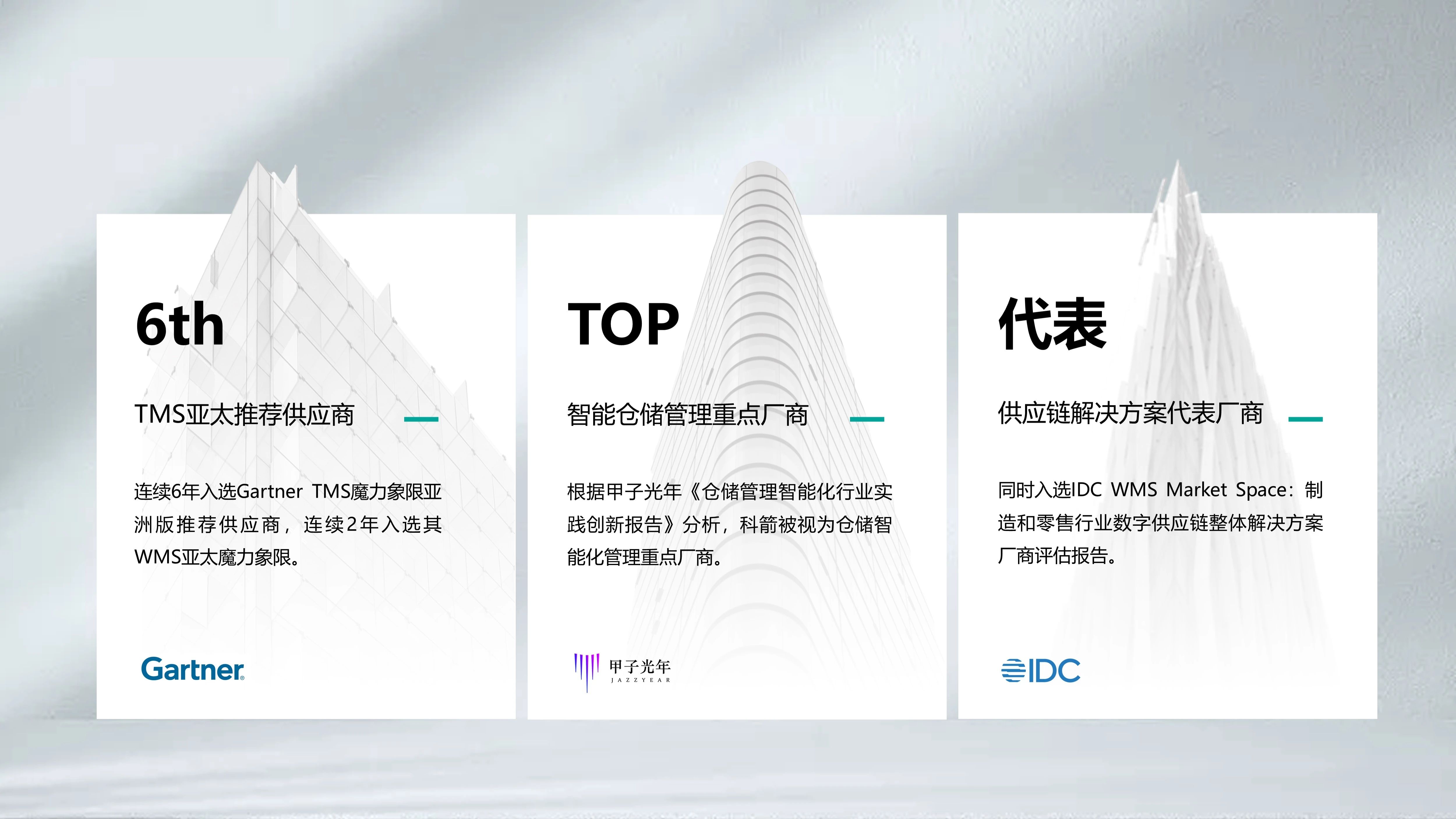 很榮幸,我們的產品服務作為典型被多份重磅行業報告收錄和推薦,其中已連續6年入選Gartner TMS/WMS魔力象限亞太版。除此之外,更憑借創新物流技術走向應用落地和商業化的成功案例獲得了媒體的諸多認可。