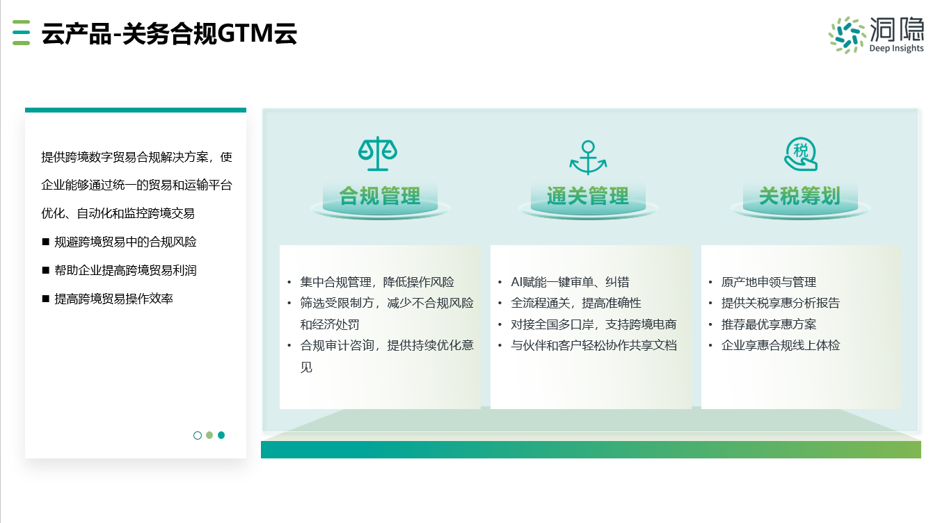 在此背景下,洞隱推出了關務合規(guī)GTM云,為企業(yè)提供跨境數(shù)字貿易合規(guī)解決方案,使企業(yè)能夠通過統(tǒng)一的貿易和運輸平臺優(yōu)化、自動化和監(jiān)控跨境交易,規(guī)避跨境貿易中的合規(guī)風險,幫助企業(yè)提高跨境貿易利潤,提高跨境貿易操作效率。