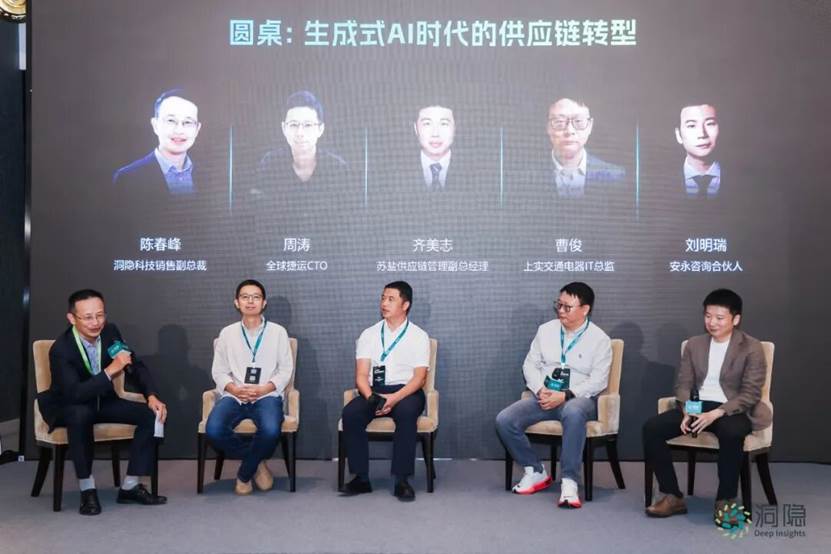 在最后的圓桌對話環(huán)節(jié),洞隱科技銷售副總裁陳春峰攜全球捷運CTO周濤、蘇鹽供應鏈管理副總經(jīng)理齊美志,以及分享嘉賓曹俊與劉明瑞,圍繞“生成式AI時代的供應鏈轉型”這一話題,展開探討了AI技術如何在供應鏈管理中發(fā)揮關鍵作用,提升數(shù)據(jù)價值。