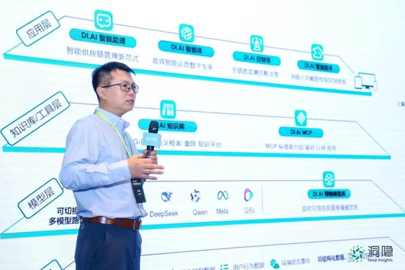 隨后,洞隱科技創(chuàng)始人兼CEO劉斌正式發(fā)布了洞隱DI.AI智能產(chǎn)品戰(zhàn)略,提出“讓每一條供應鏈數(shù)據(jù)都能被AI理解”。DI.AI產(chǎn)品體系涵蓋智能控制塔、智能助理、智能助手、智能體、知識庫、預置模型庫及MCP工具集。他強調(diào),我們正進入供應鏈軟件的“AI智能時代”,其核心是從“數(shù)據(jù)連接”躍遷至“數(shù)據(jù)理解”,讓AI真正訪問、洞察并行動于每一條供應鏈數(shù)據(jù),最終實現(xiàn)“AI增強-AI原生-AI生態(tài)”的全面賦能。