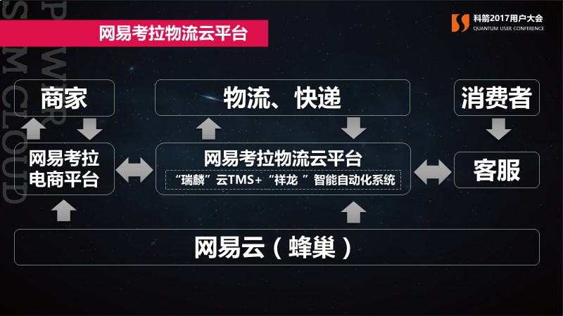 基于以上思考我們與科箭一起聯合打造了“瑞麟”TMS云平臺,再加上“祥龍 ”智能自動化系統,構成了網易考拉的物流云平臺。基于網易云把網易考拉平臺上的商家、用戶、消費者、客服、快遞無縫連接,整個訂單履約環節做得更清晰更明確。