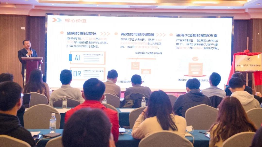 秦虎教授介紹了華中大—科箭人工智能研究中心研究內容及其核心價值。實驗室致力于為客戶構建基于AI及運籌優化的智能決策平臺,提供面向企業供應鏈管理各環節的一體化解決方案。借助自主研發的問題求解器和仿真優化平臺,可快速為客戶開發和部署通用化和定制化的智能決策產品。秦教授強調了華中大-科箭人工智能研究中心與一些人工智能服務企業相比的優勢所在: