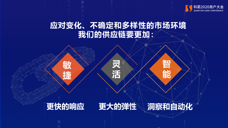 劉斌在主題演講中指出,供應鏈需要重構,因為我們面臨著一個變化的、不確定的、多樣化的世界。要應對這些挑戰,我們需要重構供應鏈。在過去幾年的科箭用戶大會上,劉斌就曾提到過供應鏈網絡化及數字化技術的賦能等關鍵詞,我們的供應鏈要更加: