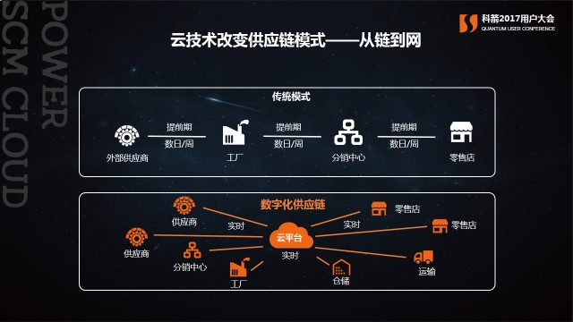 云技術改變了供應鏈的模式,使供應鏈從傳統的鏈式到網狀,信息實時傳遞,多方高效協同,提高供應鏈效率及響應能力。
