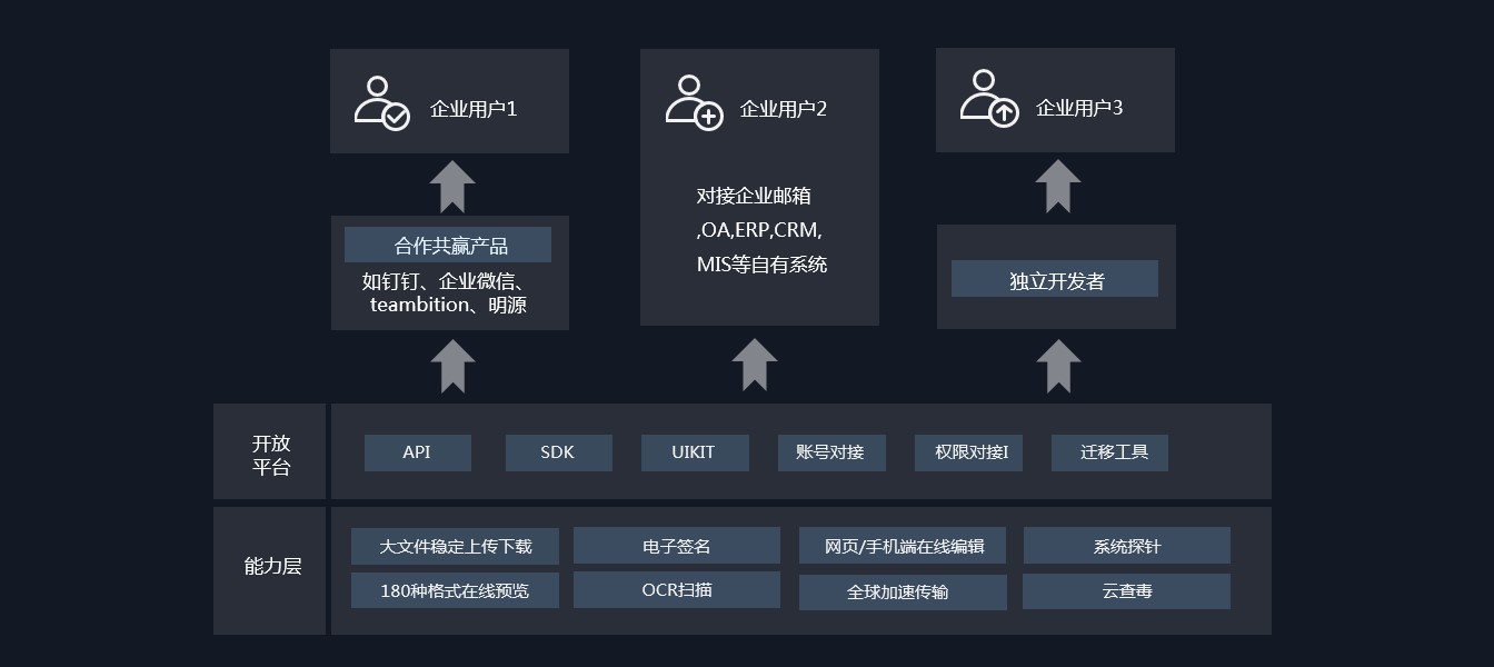 除了上述產品自身的眾多創新成果外,億方云還與眾多第三方應用進行集成,通過API、賬號對接、權限對接等融入辦公生態,融合了包括一起寫的在線編輯能力、Teambition的文件協作能力、綠盟的平臺加固等安全能力及浩辰軟件在建筑行業的特殊格式文件預覽能力等,為自身產品整體賦能。